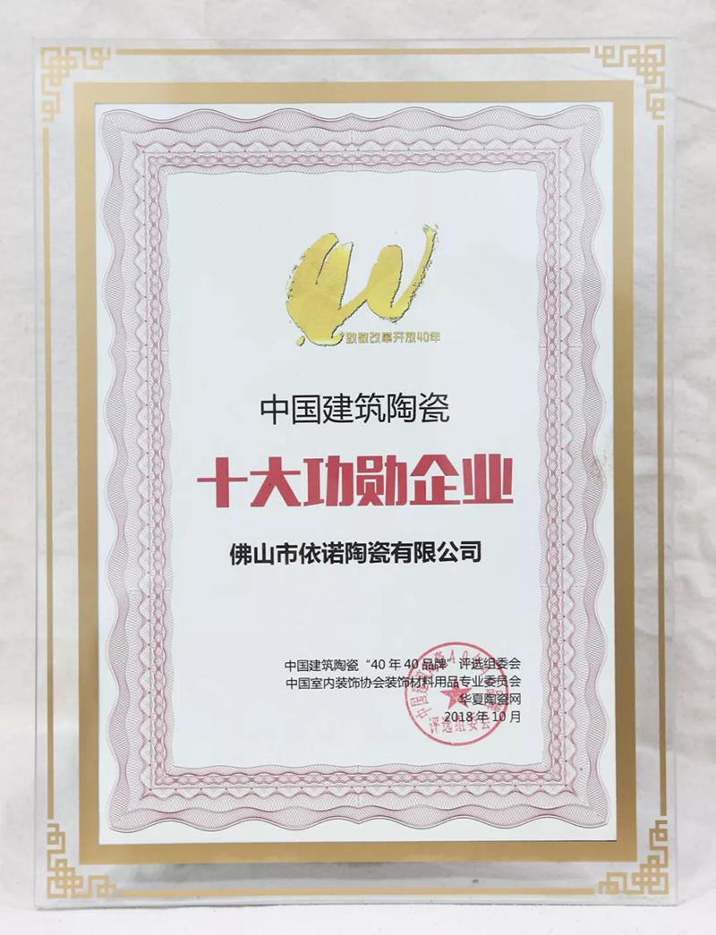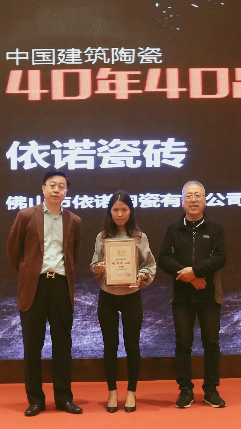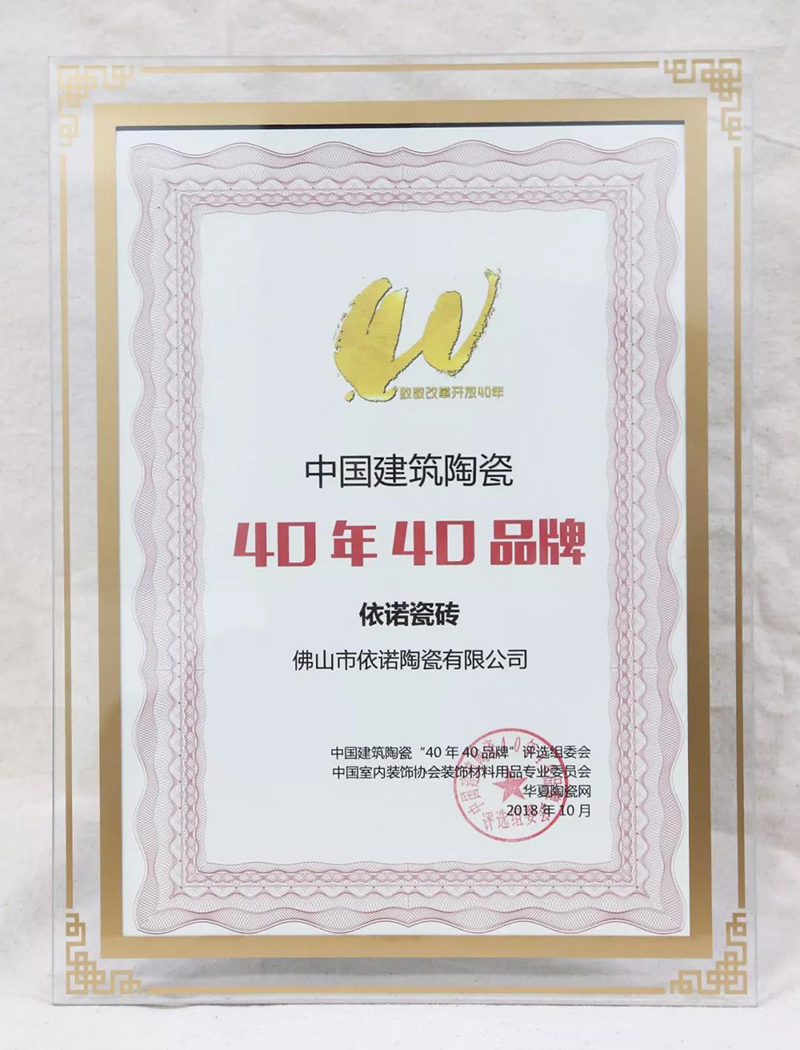 2018年,時值中國改革開放40年。10月15日,中國室內裝飾協會聯合華夏陶瓷網在廣州白天鵝賓館,舉辦“致敬改革開放40 年:建筑陶瓷影響力品牌論壇暨40年40品牌頒獎盛典”。依諾瓷磚憑借實力一舉攬獲 “中國建筑陶瓷40年40品牌”、“中國建筑陶瓷十大功勛企業”以及“中國建筑陶瓷百強品牌”三項大獎!