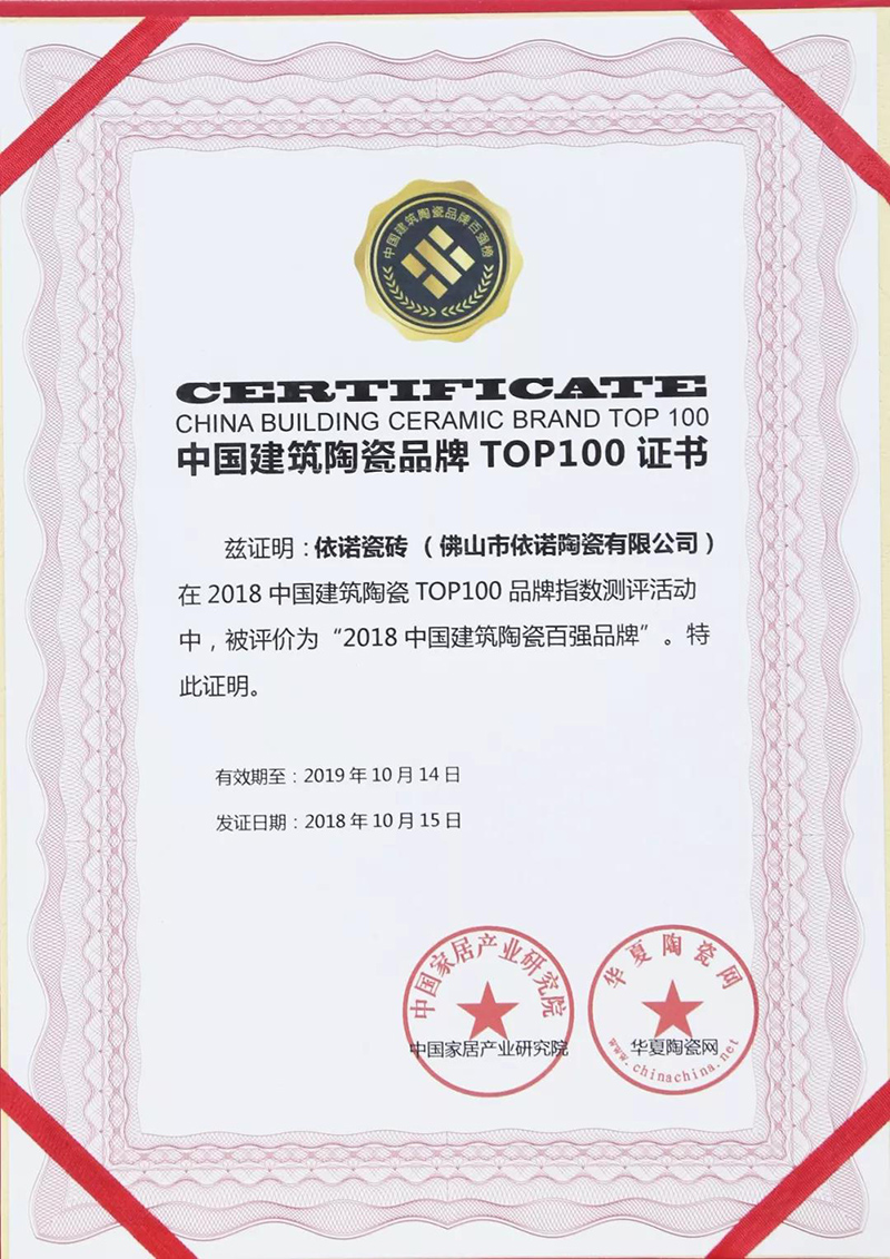 依諾榮獲“2018年中國建筑陶瓷百強品牌”證書▲
