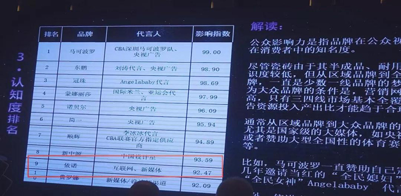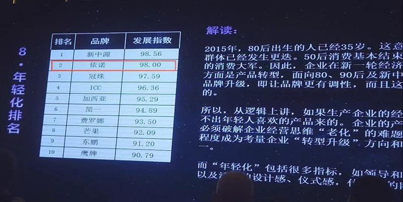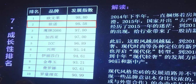 在主委會官方發布的《中國建筑陶瓷品牌發展指數報告》中,依諾瓷磚品牌在認知度、成長性和年輕化等多項指數中名列前 茅。