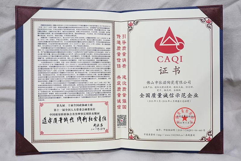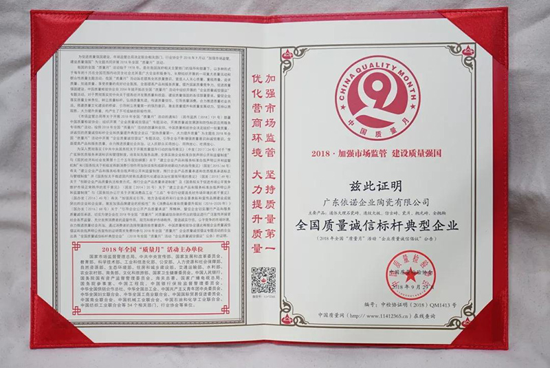 2018年9月,國家市場監督管理總局、中共中央宣傳部聯合相關部門及中國質量檢驗協會,以“加強市場監管,建設質量強國”為主題,共同開展2018年全國“質量月”活動(以下簡稱2018“質量月”活動),依諾瓷磚企業積極響應號召,憑借二十年如一日的誠信經營、優質的產品和良好的口碑,在本次2018“質量月”活動中脫穎而出,廣東佛山依諾瓷磚企業榮獲“全國質量誠信標桿典型企業”、佛山依諾瓷磚企業榮獲“全國質量誠信示范企業”兩項榮譽稱號。