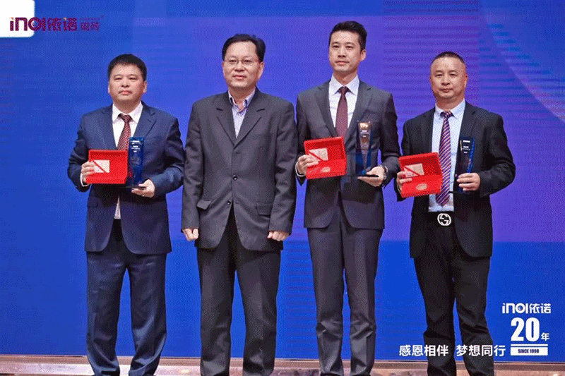 ▲左起:依諾企業(yè)總經(jīng)理郭萬龍;依諾制造中心采購(gòu)部總監(jiān)戴富順;依諾企業(yè)董事長(zhǎng)戴進(jìn)財(cái);依諾制造中心儲(chǔ)運(yùn)部總監(jiān) 范柏成;依諾企業(yè)營(yíng)銷總經(jīng)理田慶忠; 依諾瓷磚品牌20周年 | 頒獎(jiǎng)典禮回顧 ▼ 【功勛獎(jiǎng)】 ▲左1:依諾企業(yè)總經(jīng)理郭萬龍 發(fā)表獲感言 “20年,你看到依諾的成長(zhǎng),而我更在乎有你們的陪伴…” ▼ 【最佳貢獻(xiàn)獎(jiǎng)】