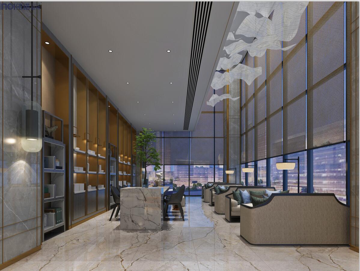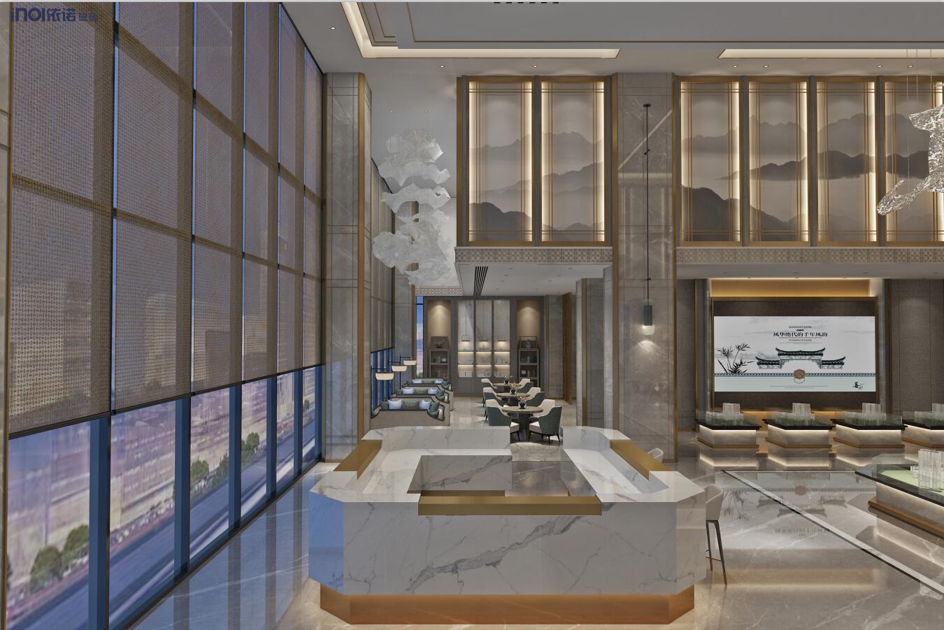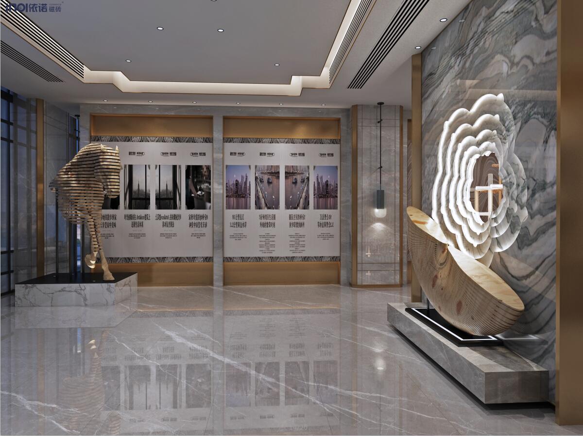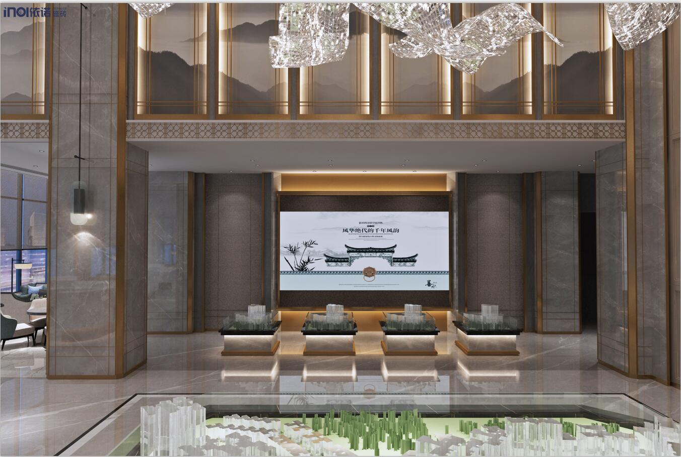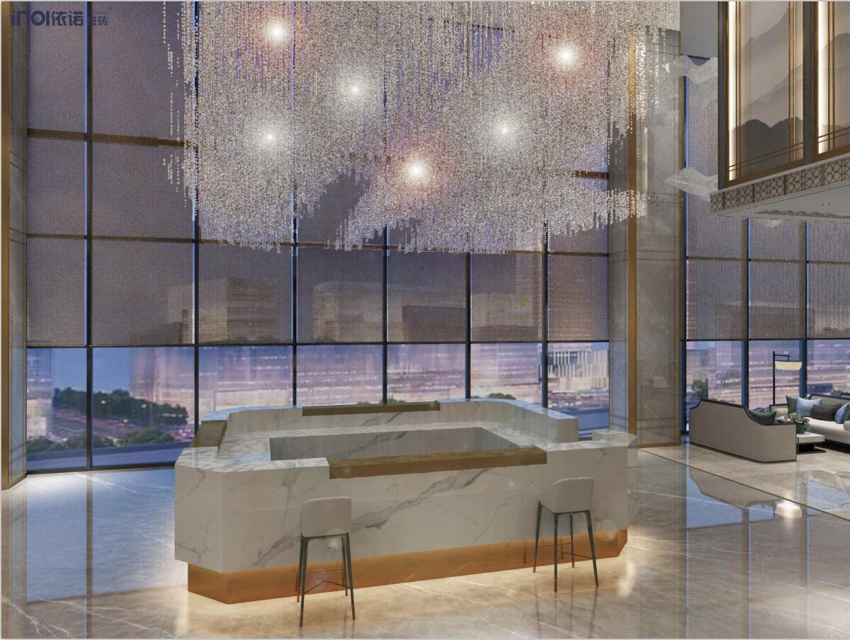 從沙盤大廳到接待區,天花采用了挑高的設計手法,豁然開朗,中空墻身一側為山水水墨畫,另一側為依諾大理石瓷磚【連紋大板】千巖競秀系列,明凈的白色大理石紋,主次分明,精致簡約,增添了空間的柔和感。