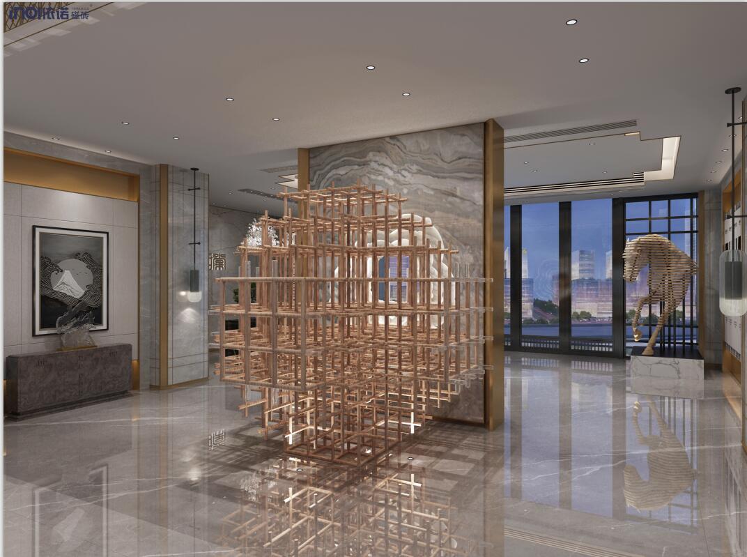 前廳與沙盤大廳采用大理石屏風隔斷,梅花造型的燈光裝置,層疊在動感十足的大理石紋上,呈現“落花流水”的意趣,以創意木雕擺件為裝飾,刻畫充滿現代感的線條,流露出奢雅格調。