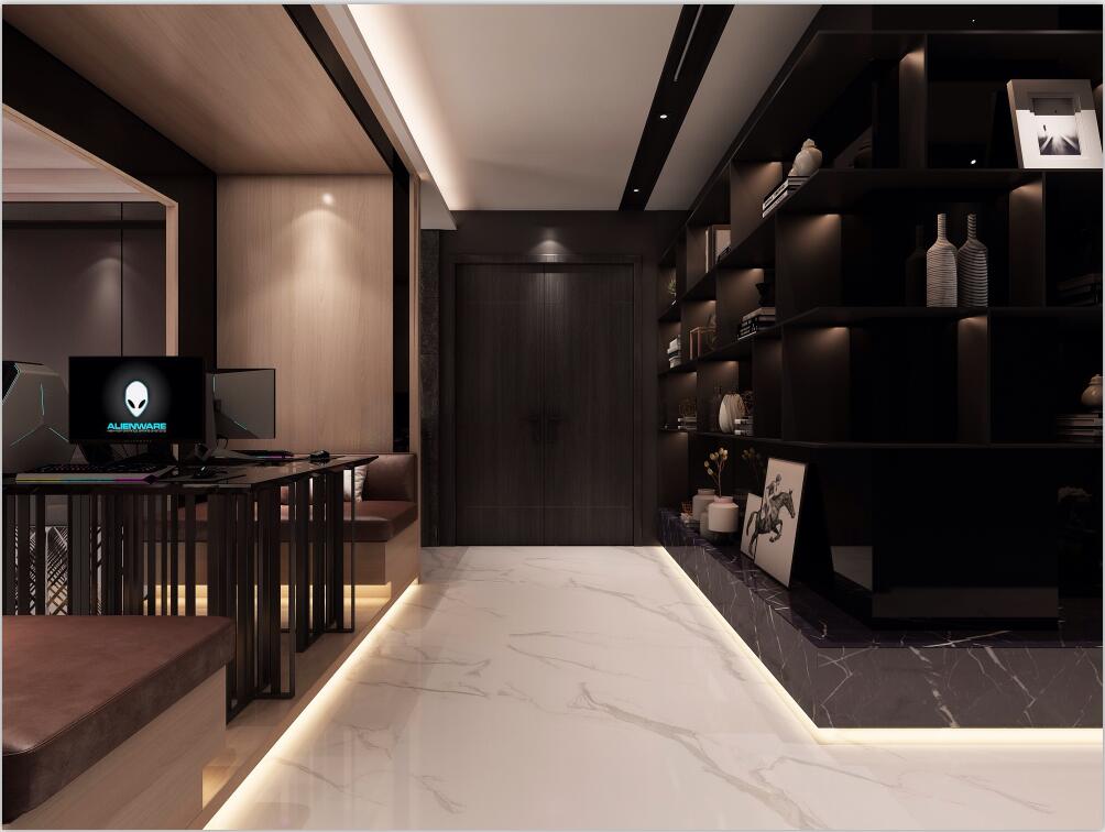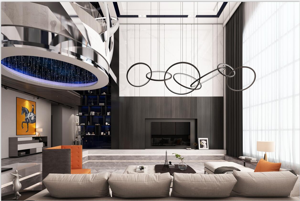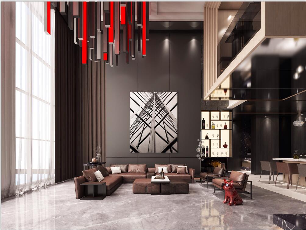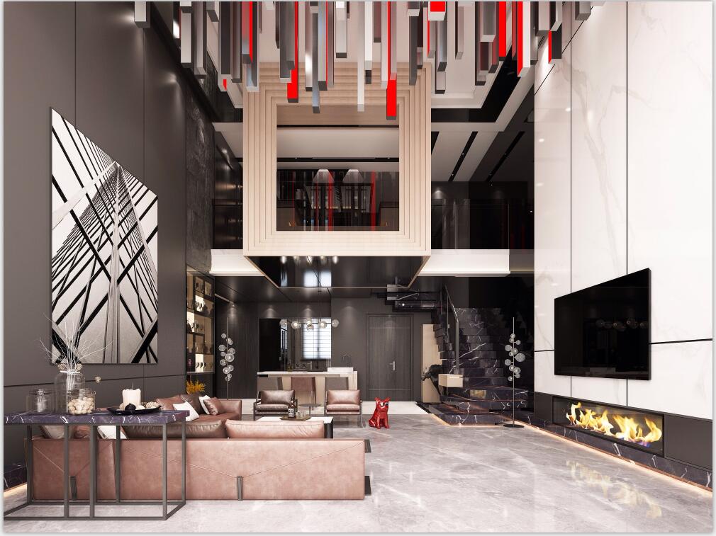 本案為現代主義風格家裝設計,充分運用空間中的層次與交錯組織,把形式與空間進行有機結合。運用點、線、面的空間元素,使空間中的物體組合具有強烈的美感;吊頂上黑、紅兩種恰到好處的色彩比例,為空間增添了強烈的現代科技感;最后,所營造出的居家氛圍可以使居室主人得到徹底的放松。