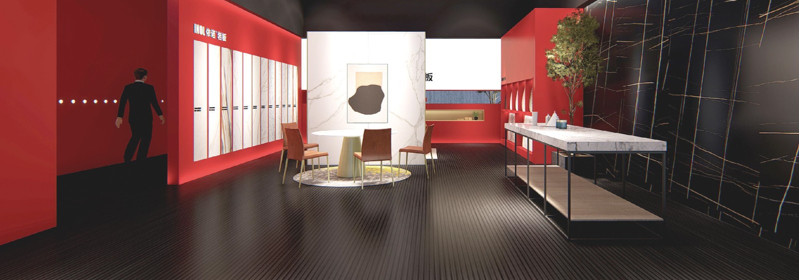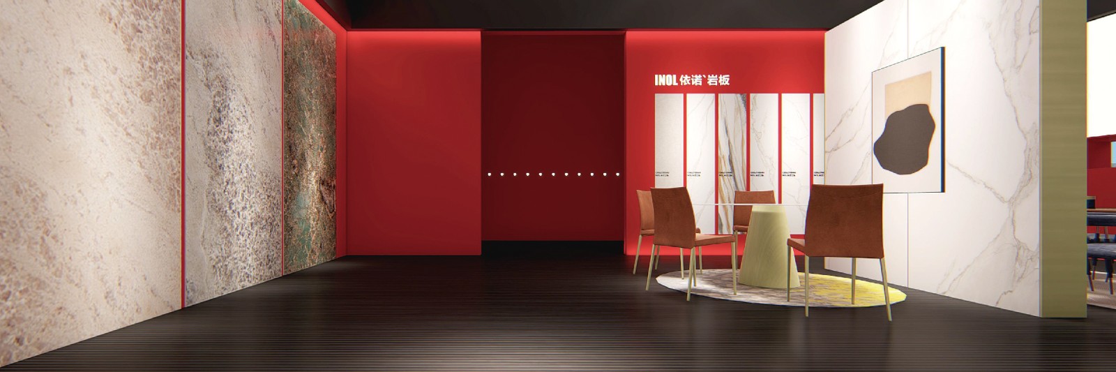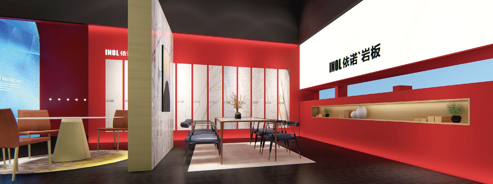 依諾巖板展位14號館A05B為現代簡奢風格,以極具象征性的「中國紅」為主色調,為觀眾們展示國際化的中國現代設計力量。
