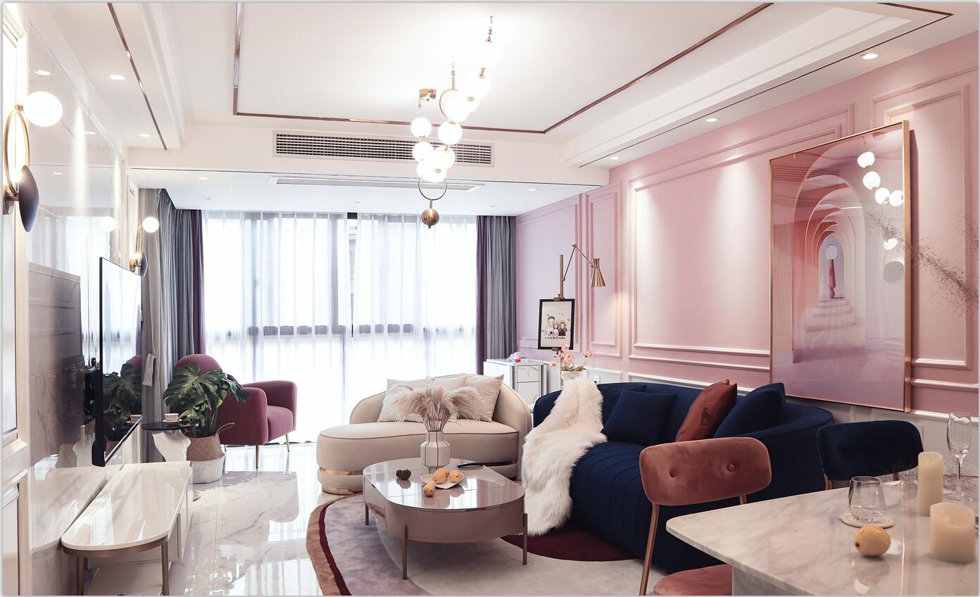 在色彩測試中,陳女士選擇了不同程度的粉色、紫色、藍(lán)色,這是典型的浪漫格調(diào)的色彩組合。所以,盧蓉蓉最終將設(shè)計(jì)風(fēng)格設(shè)定為浪漫主義輕奢,將屋主喜愛的色調(diào)融入室內(nèi),讓空間圍塑出輕盈甜蜜的氛圍。