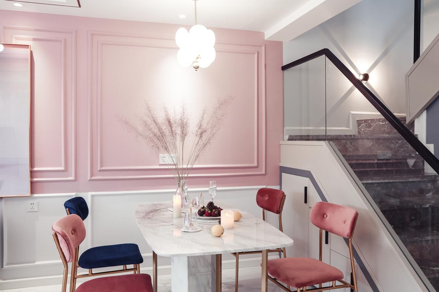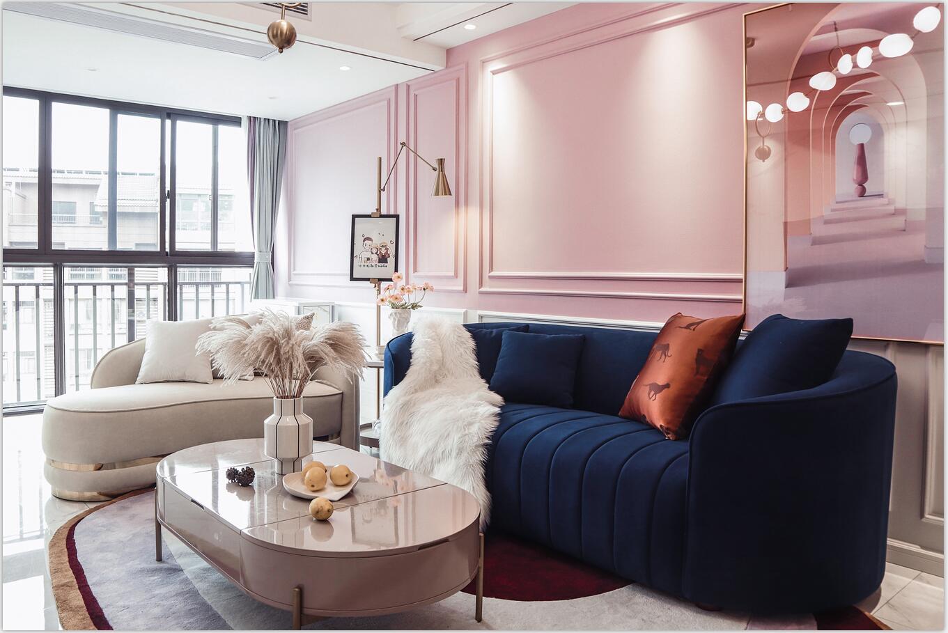 在甜蜜的粉色維度里,設(shè)計(jì)師巧妙地運(yùn)用藏青、淺咖色,絨面、金屬、木質(zhì),通過質(zhì)感的變化調(diào)劑著居所的輕松氛圍,打造出一個(gè)具有生活溫度的柔軟空間。