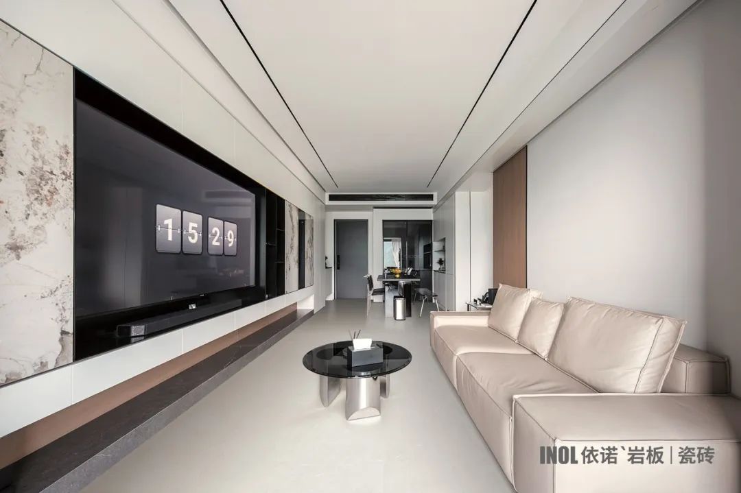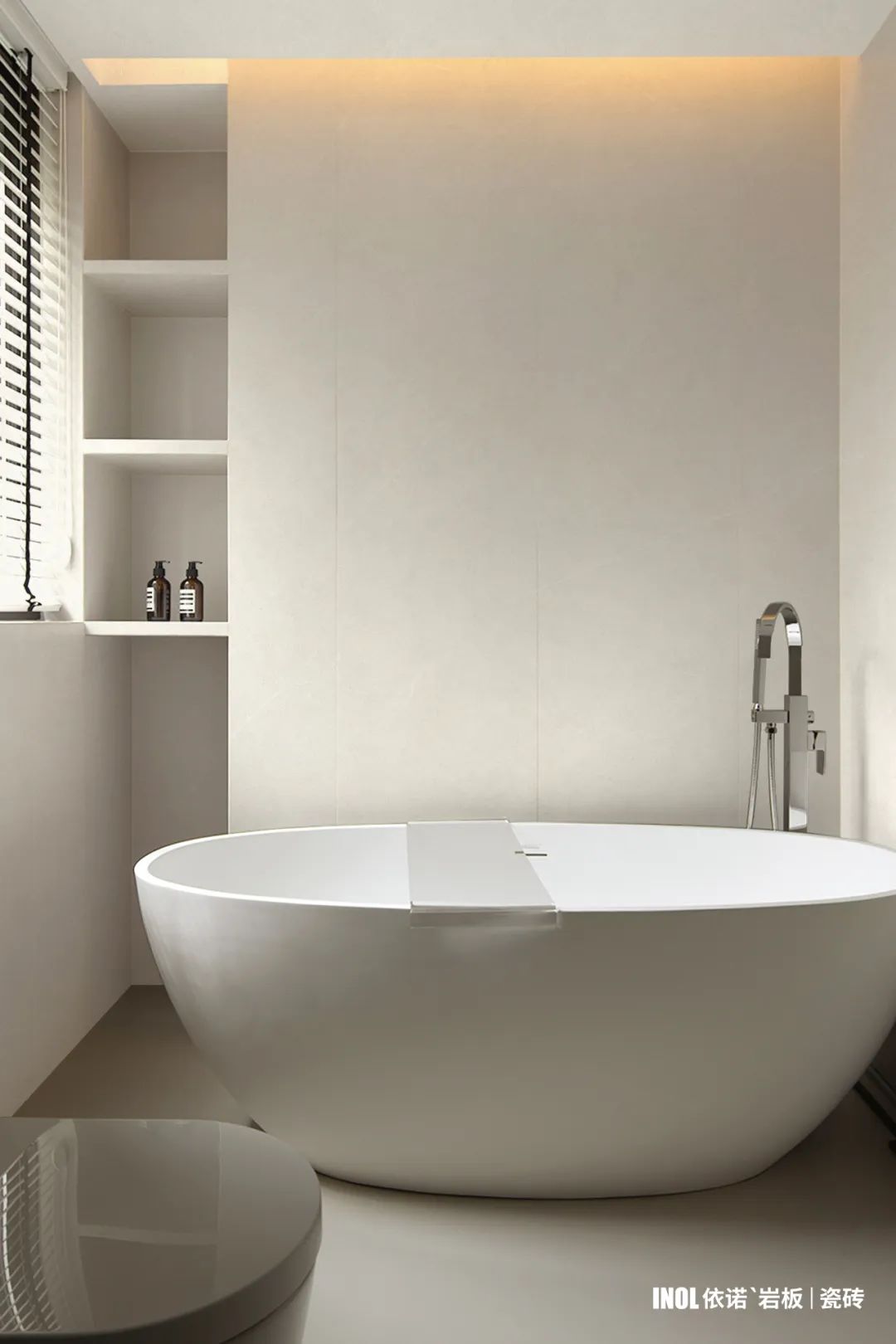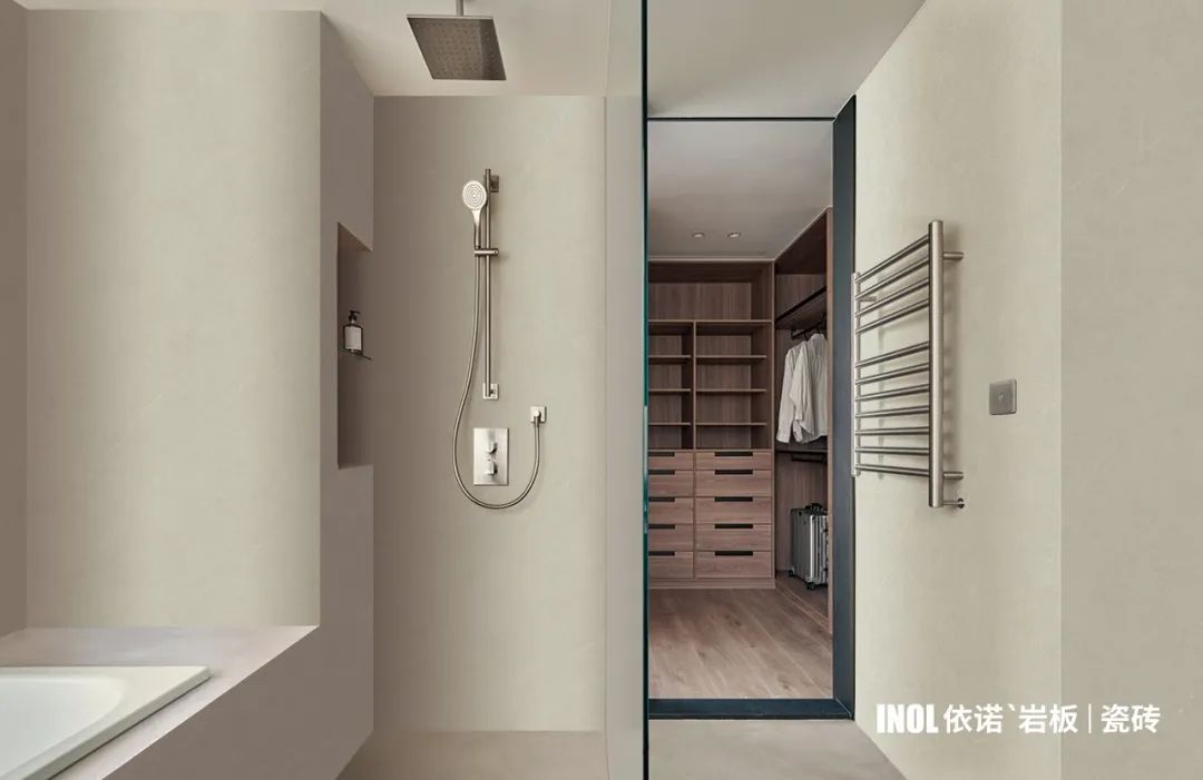 【海巖灰】配置的是1000×2500mm大規格,這個尺寸可以說是800×2600mm的互補選項。后者是一個窄長的比例,更適合墻面,用于地面的時候,視覺感受還是1000×2500mm更和諧一些。因此,【海巖灰】鋪貼于客廳、餐廳等公共區域,能擴大空間的尺度感。同時,一般家庭的洗手間吊頂后的墻面高度是2400mm,而巖板【海巖灰】用于衛浴墻面則可一片到頂,不僅浪費更少,還可實現更高階的審美。
