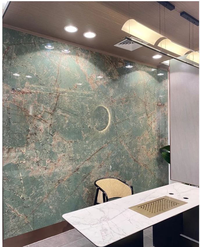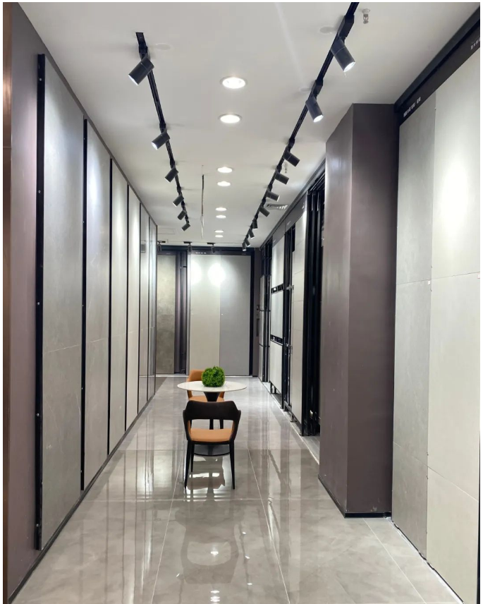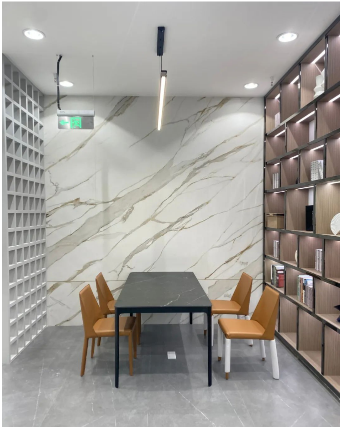 門店入口與接待處,使用了當下更受歡迎的侘寂風格的依諾微水泥瓷磚,細膩的紋理和通透的空間感,舒適寂靜的氛圍在這里悄然上演。市面上流行的風格所需要的瓷磚,在依諾巖板瓷磚都能輕松找到,能夠輕松留住客戶。