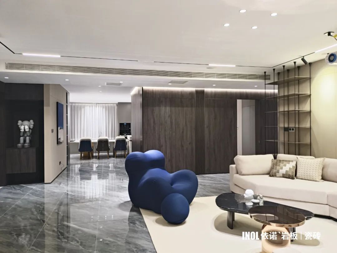 公共區(qū)域地面通鋪依諾瓷磚【雅典灰】,搭配溫潤醇厚的原木元素,營造出松弛靜謐的家居氛圍;一抹克萊因藍(lán),增添空間藝術(shù)感。