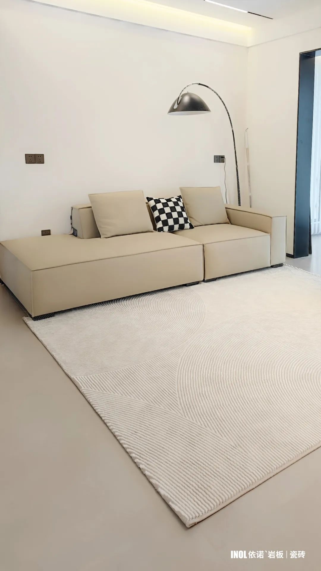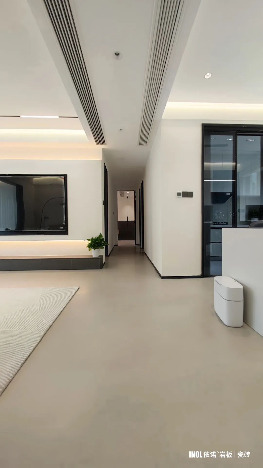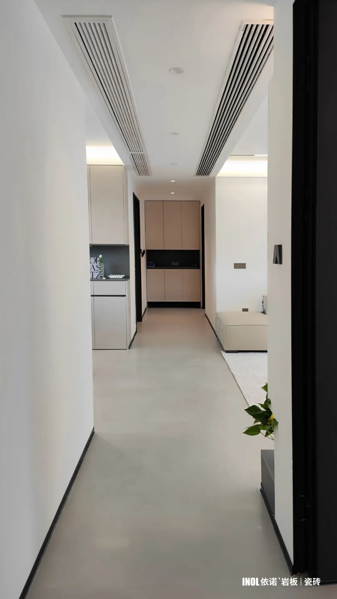 全屋以簡練流暢的動線規劃,使得整體布局更具合理性。 地面通鋪依諾微水泥肌理的瓷磚【波特蘭】,視覺統一,將簡潔靜美之意注入空間。