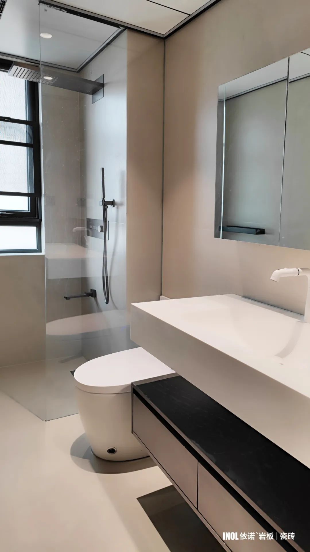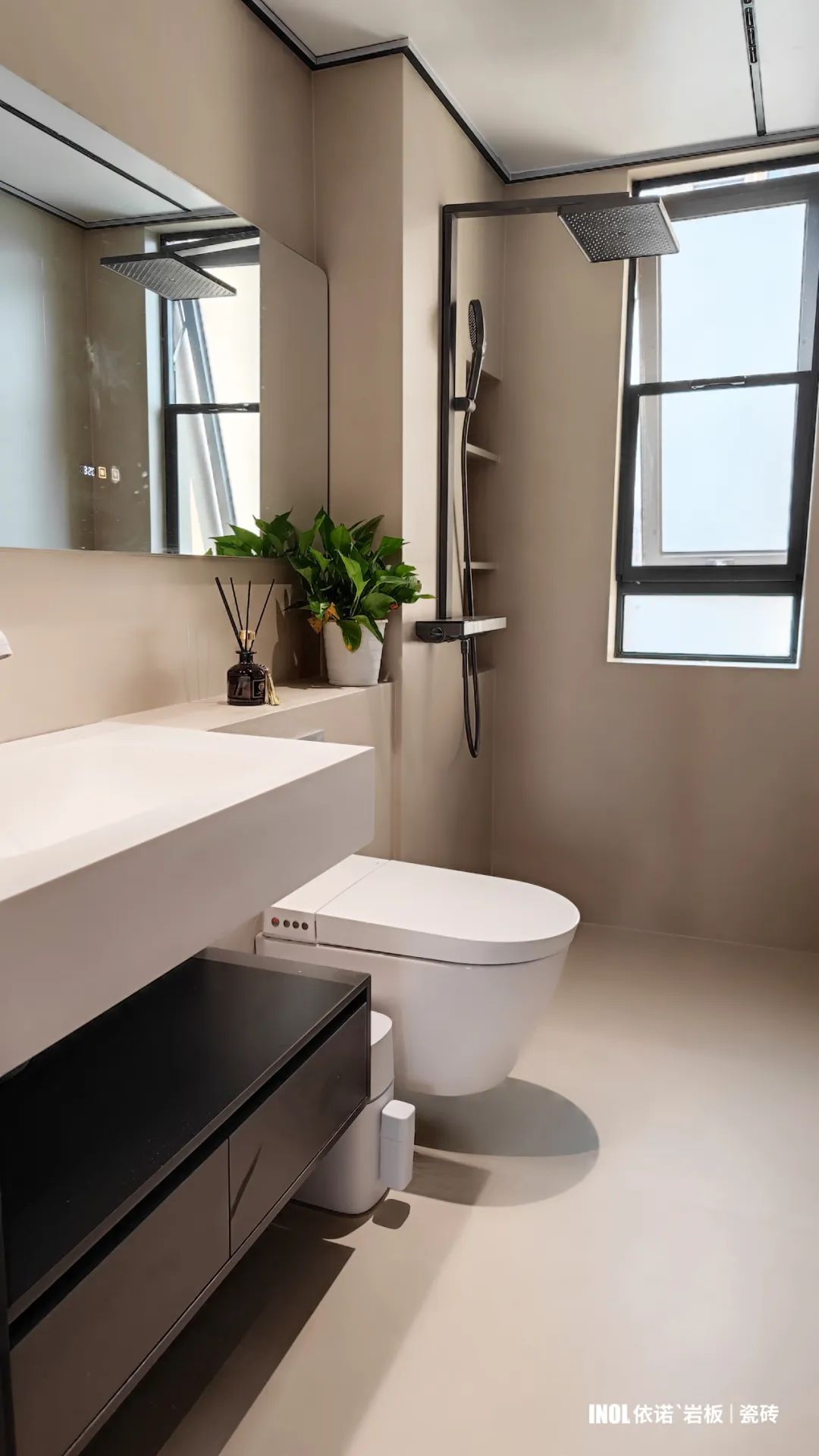 設計師貫通極簡的審美觀念,以克制手法打造舒適、精致的衛浴空間。 肌理感細膩的瓷磚【古馳灰】上墻,創造出一個可感知、松弛的場域,讓身心靜享安寧悠然。