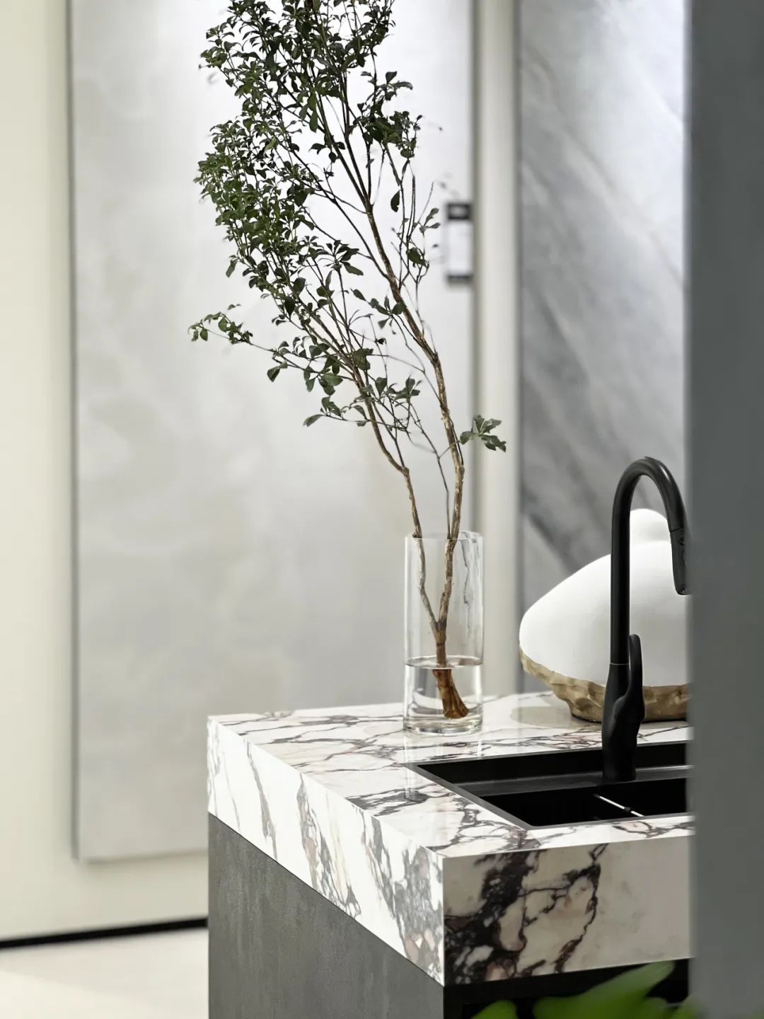 樣板空間以百搭的黑、白、灰色系的大理石紋理產品為主,選材區則以精心的比例排布和肌理變化,將色彩大膽、肌理名貴稀有的奢石/寶石系列產品融入其中,滿足業主/設計師藝術性、個性化的審美需求。