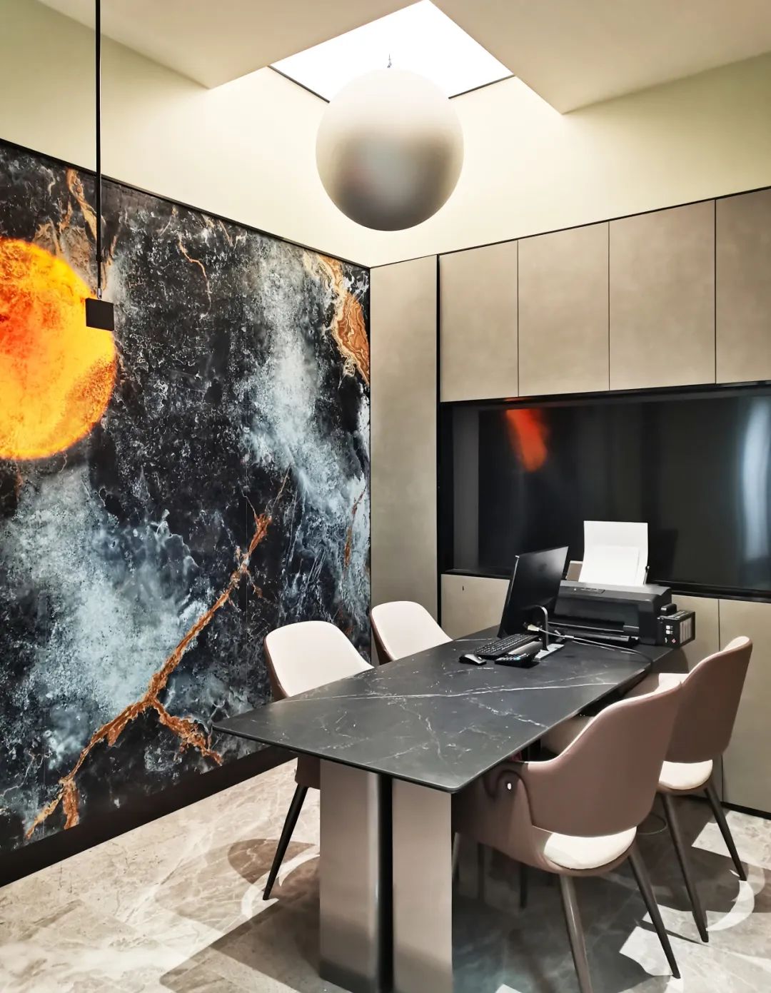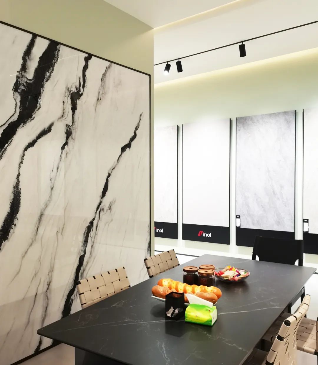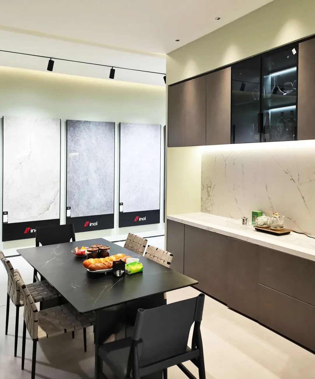 在家的情境化呈現方面,【依諾·鄭州店】利用面積優勢,通過“一體化”的方式打造【全案巖板】展示區,結合自然舒適的材質與色調,予人沉浸式的居家互動體驗。