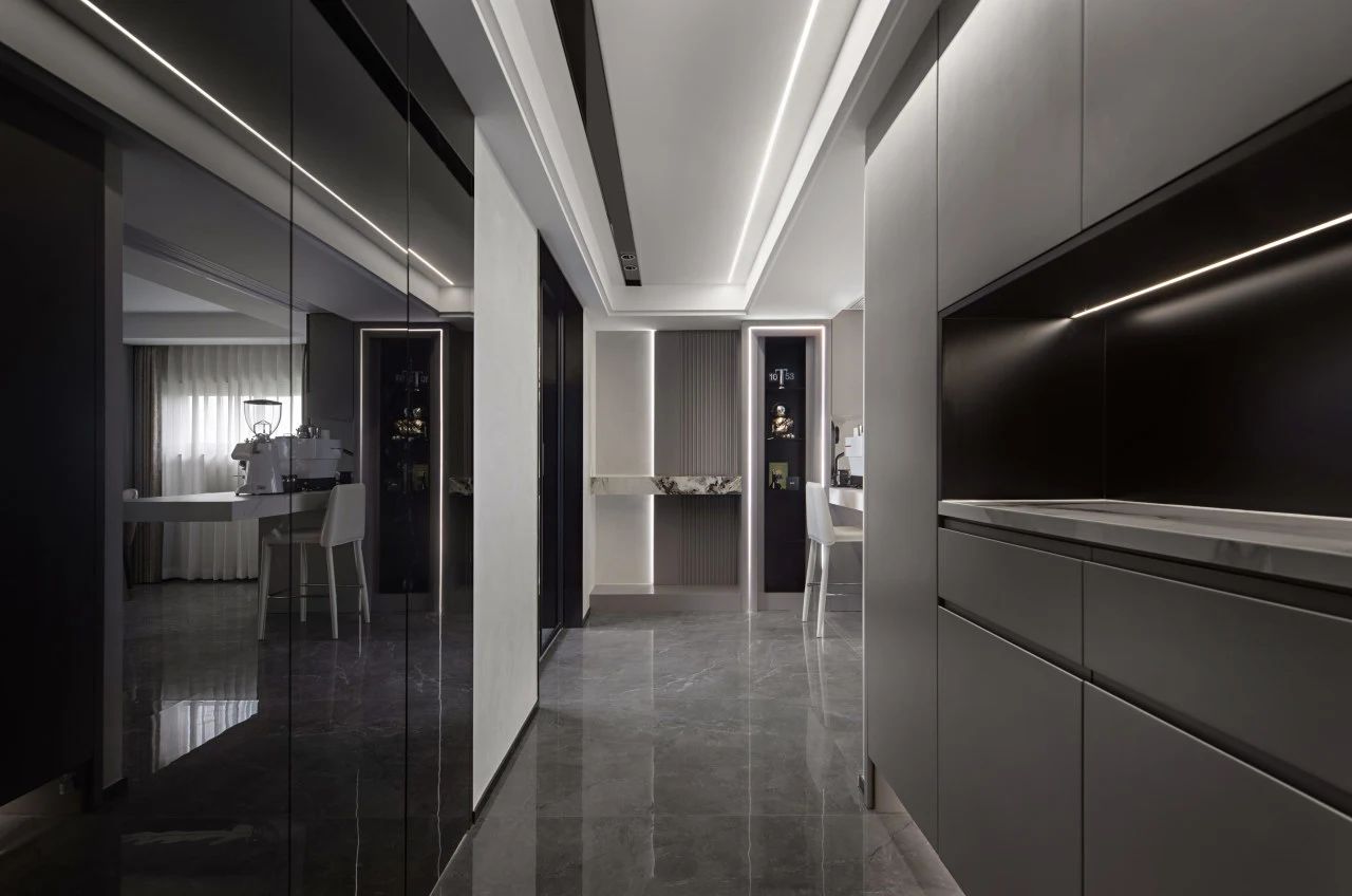 黑、白、灰為主色調(diào)空間,以依諾瓷磚【比斯特】貫穿其中,優(yōu)雅而內(nèi)斂。米白、咖啡色的出現(xiàn)打破客廳沉靜氛圍,承載起空間的溫暖情境。