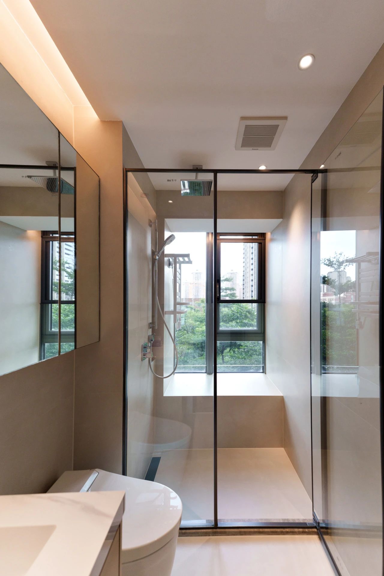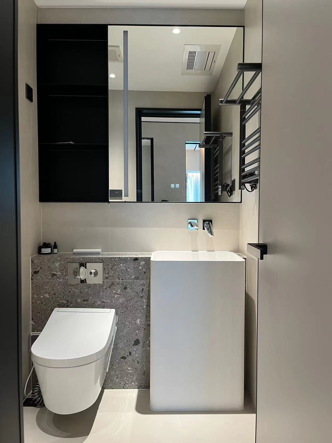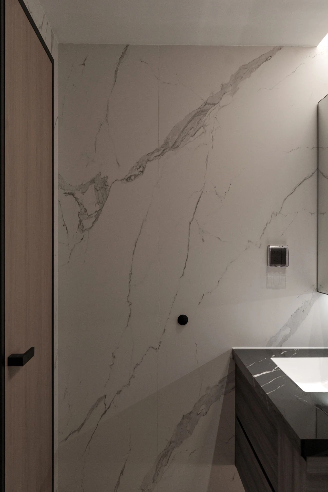 公區墻面及衛浴墻地選用膩子肌理的瓷磚產品,光感柔美,讓每一個空間在視覺上更加干凈自然又富有質感。