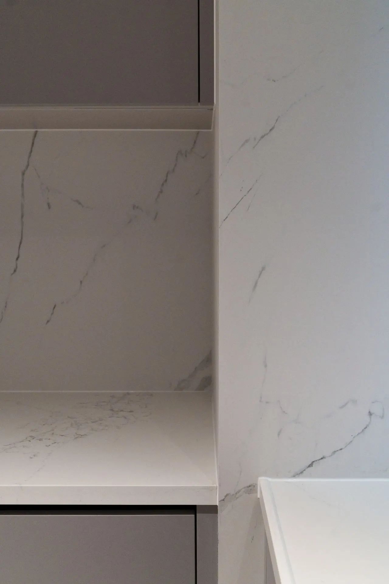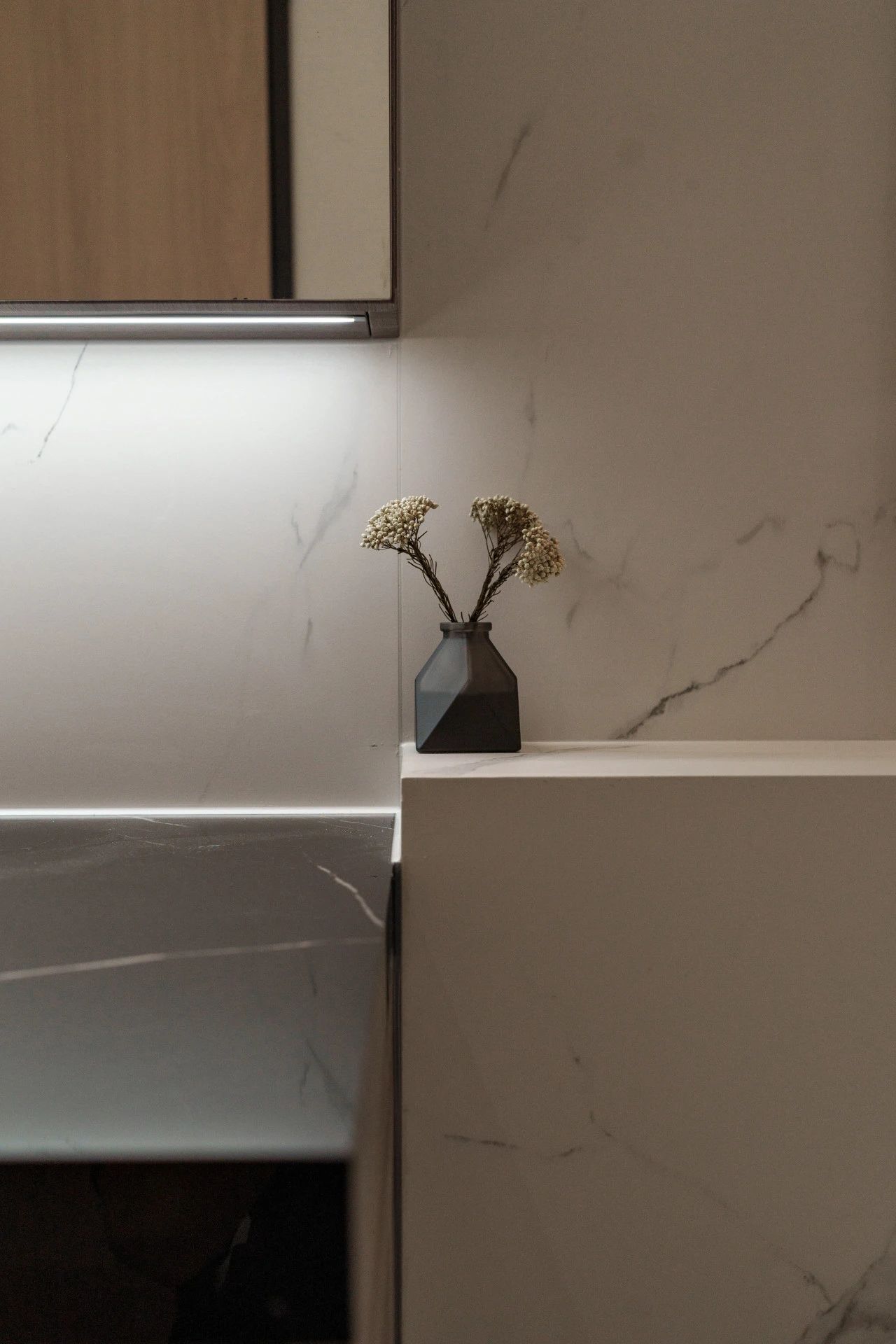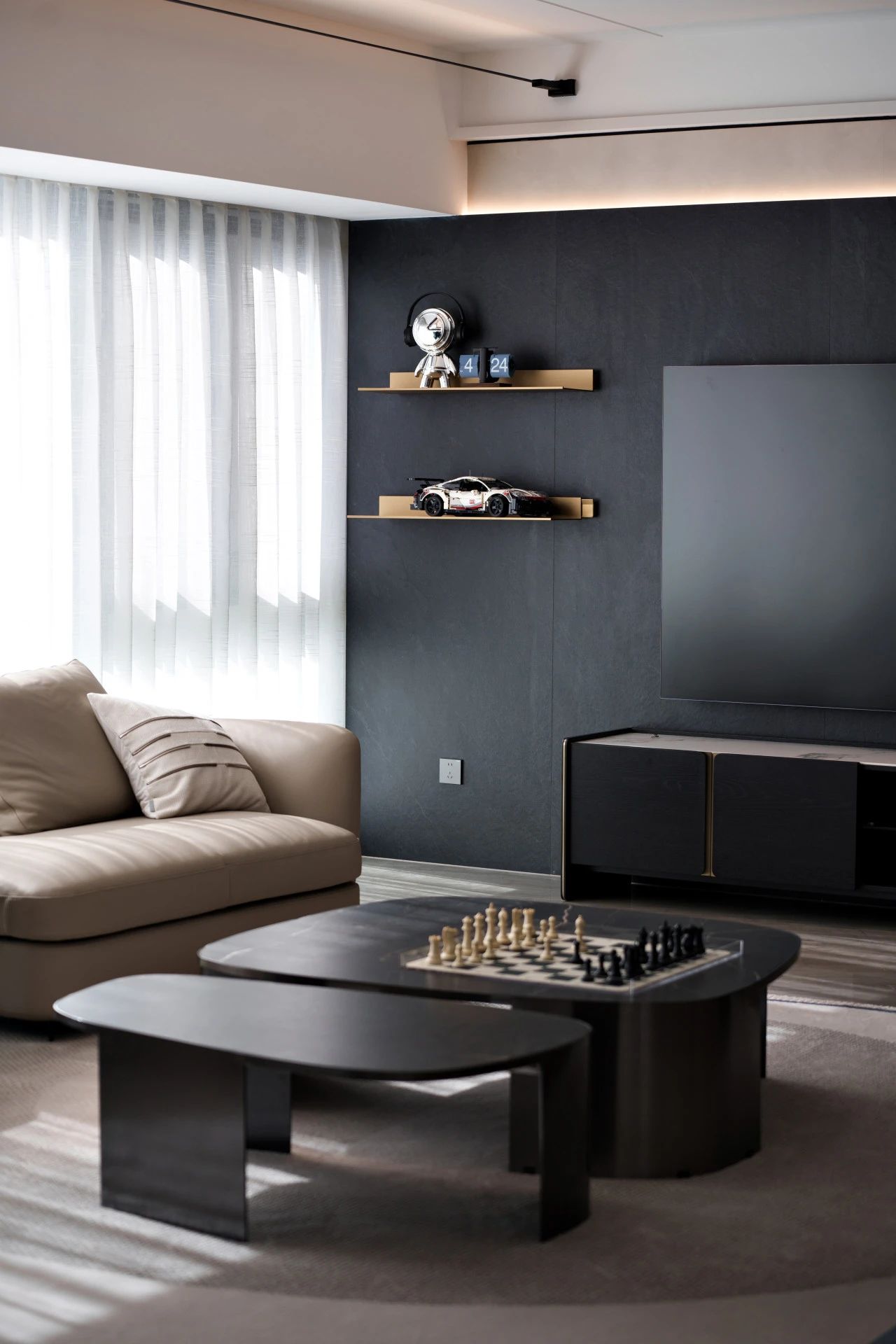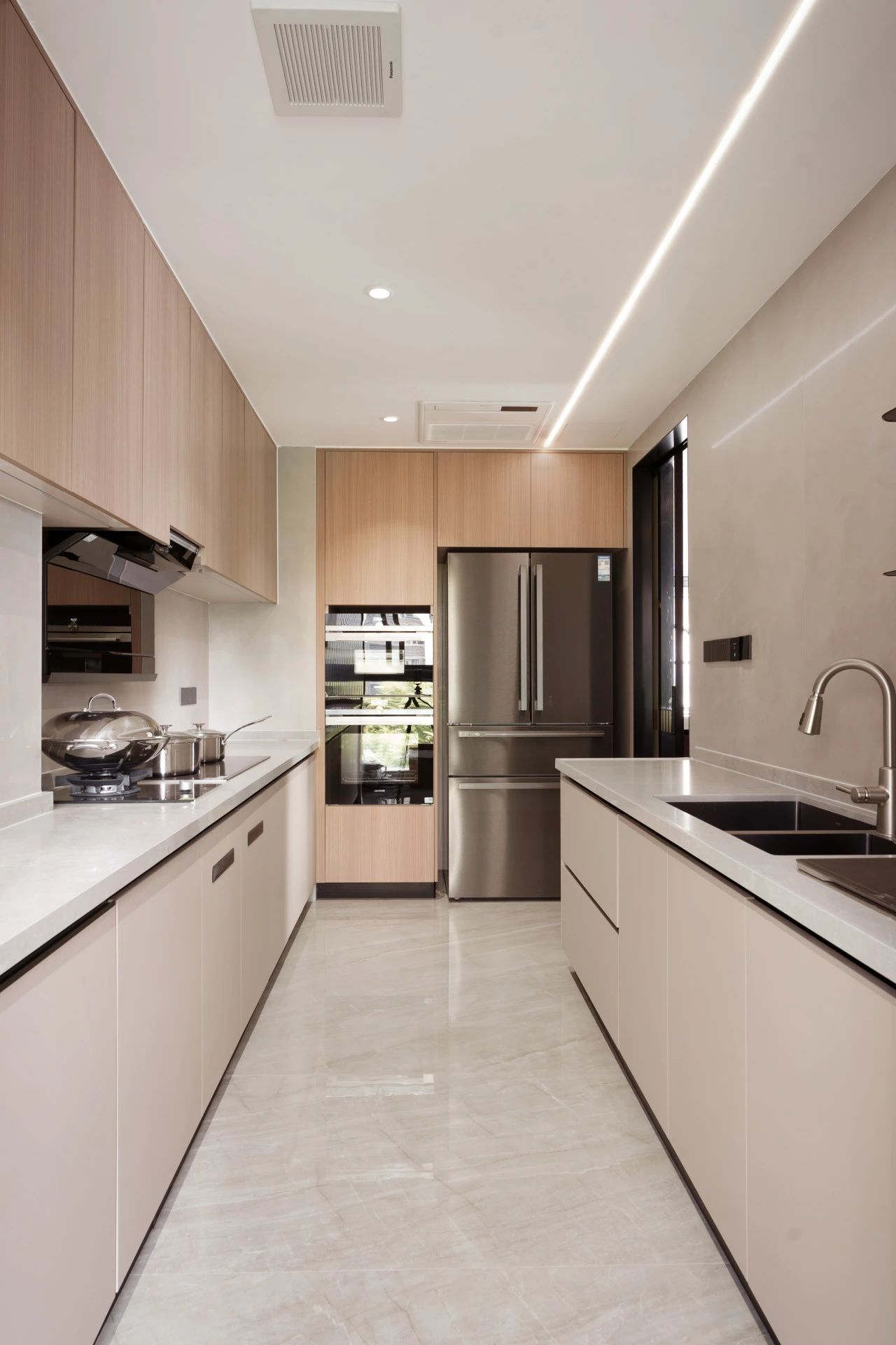 公區墻面及衛浴墻地選用膩子肌理的瓷磚產品,光感柔美,讓每一個空間在視覺上更加干凈自然又富有質感。