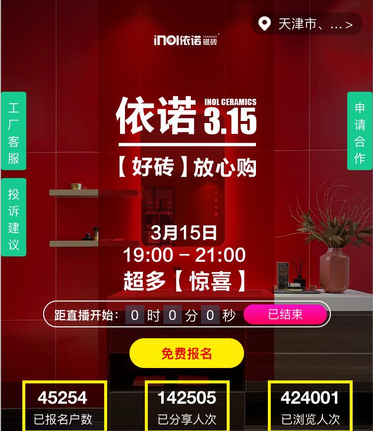 依諾瓷磚聯合南北大區多個城市進行線下爆破營銷活動,共計成交1158單!2016-2017年期間依諾瓷磚加盟專賣店從500多家迅速增加到了800多家,依諾瓷磚所到城市每場促銷活動都可謂轟動全城。