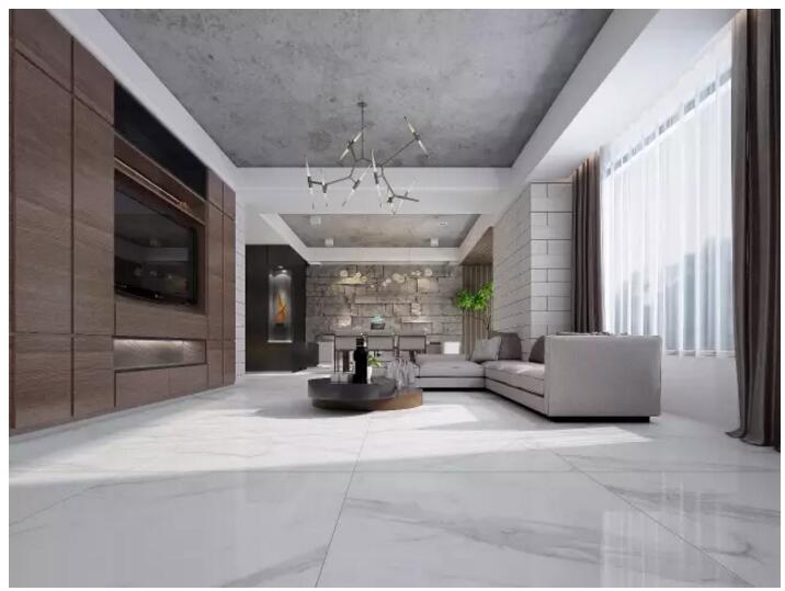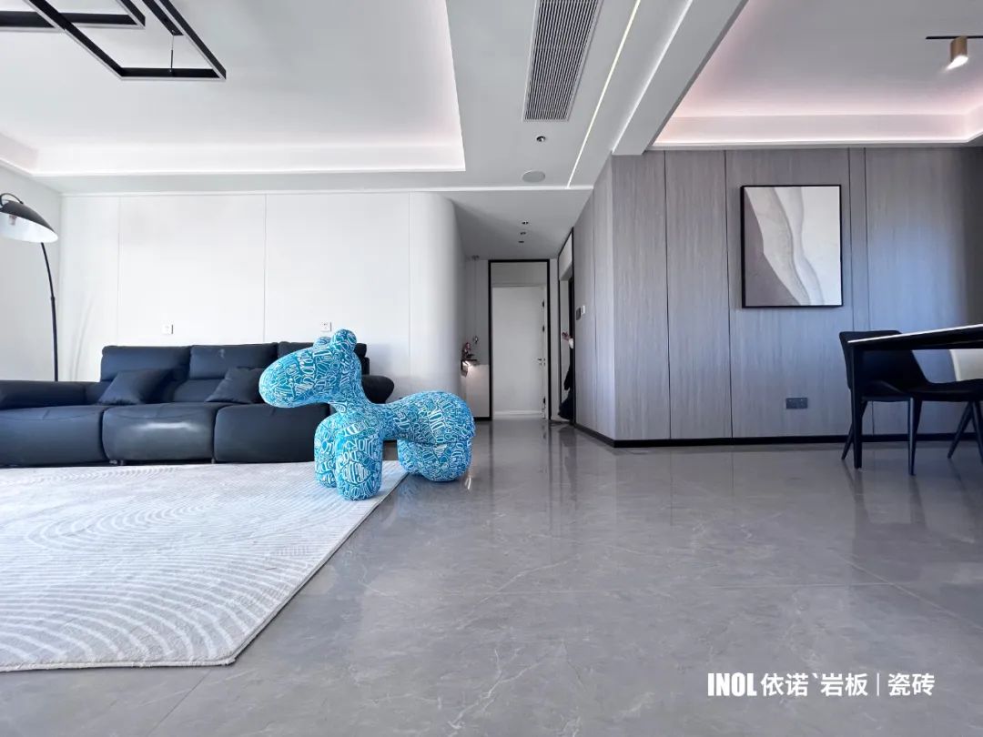重慶160㎡業主家裝案例實拍——全屋通用依諾柔光大理石瓷磚【安塔利亞灰】通鋪公共區域的地面,給空間帶來恰到好處的沉靜感,簡約靈動的線條肌理,烘托溫馨高級的家居氛圍。