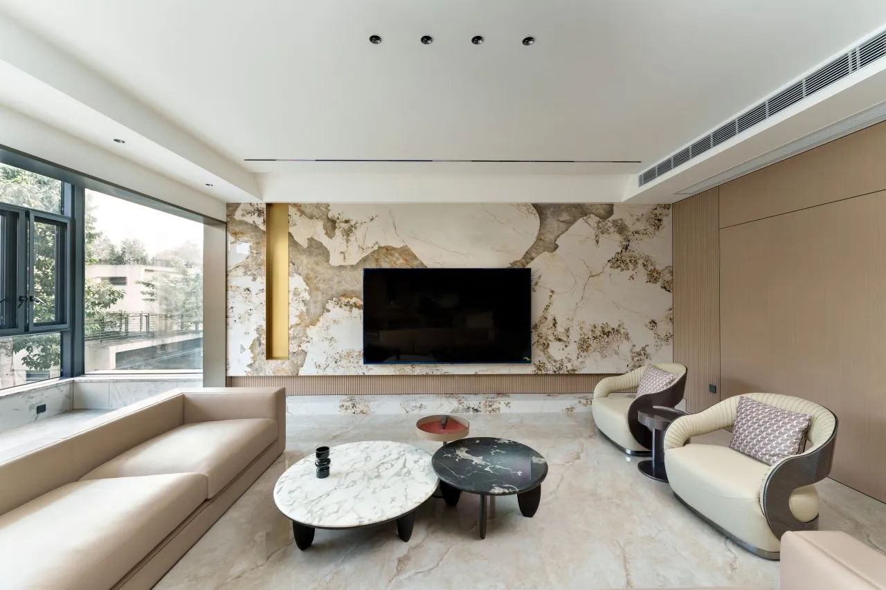 廣東佛山·凱麗山莊,600㎡現代奢宅,全屋選用地磚、背景墻、衛生間瓷磚選用依諾巖板瓷磚。