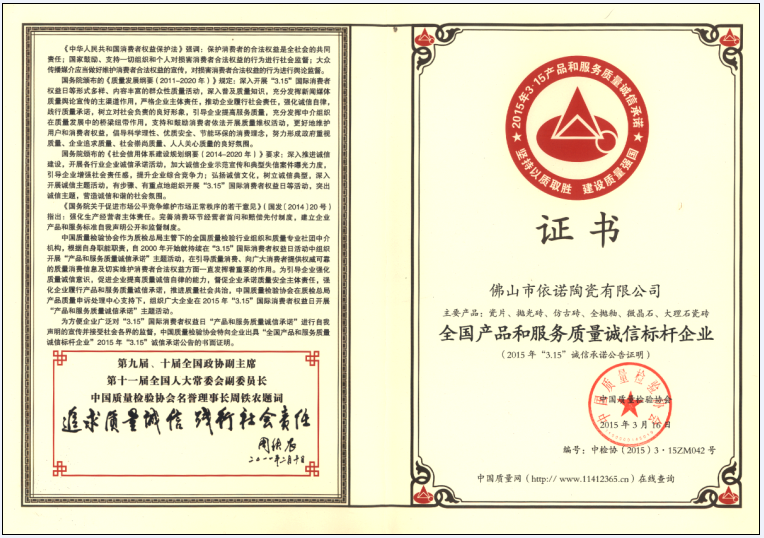 在2015年“3.15”國際消費者權益日“產品和服務質量誠信承諾”中,經國家質檢總局、中國質量檢驗協會的全面鑒定,依諾磁磚從上千家企業中脫穎而出,榮獲“全國產品和服務質量誠信標桿企業”!這是繼2014年“3.15”國際消費者權益日依諾磁磚榮獲 “全國質量和服務誠信優秀企業”之后的又一殊榮。據了解,陶瓷行業獲得本項殊榮的還有東鵬、唯美、簡一等知名企業。