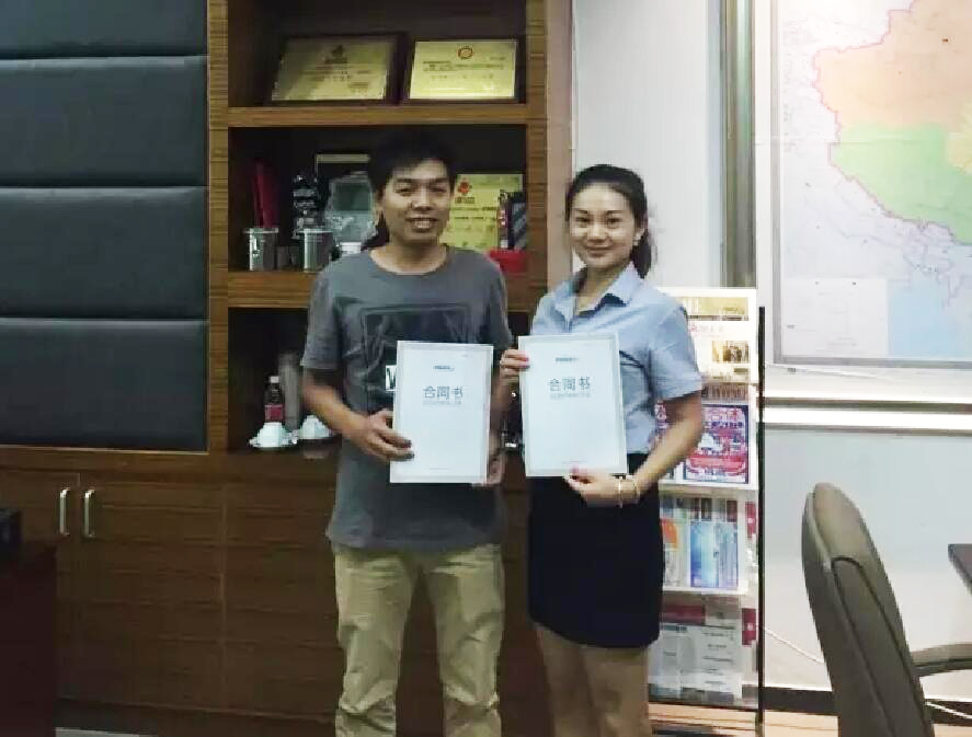 劉超,目前經營著自己的一家裝飾工程公司,在甕安麒龍摩爾建材城自購的800㎡商鋪中,計劃拿出270㎡的店面經營瓷磚。他曾經營過依諾企業旗下品牌,對依諾企業的文化,產品質量,產品花色等早已認可。6月12日,廠家業務經理得知消息后立馬趕去,經考察及認真交流后當場簽訂了甕安縣總經銷合同。