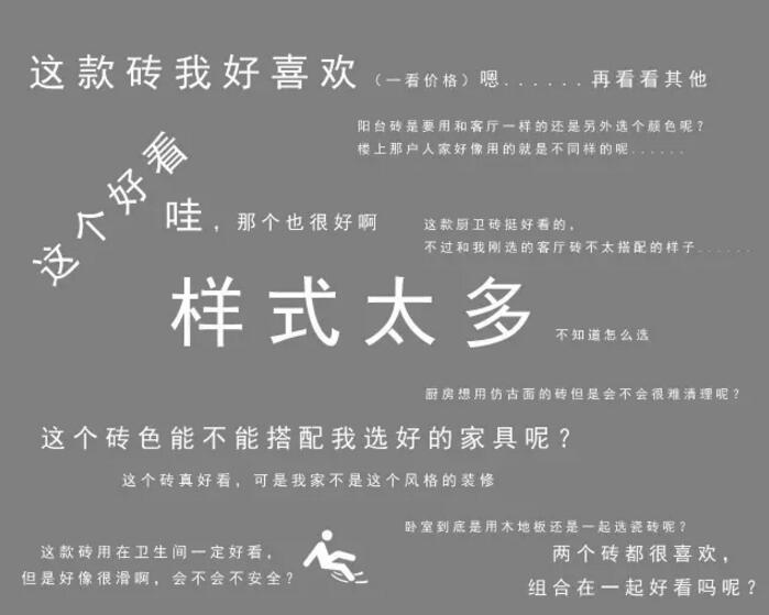 家裝的搭配復雜,單說瓷磚,你的客廳、洗手間、廚房、書房、陽臺這么多空間都要用磚,五花八門的選一通,很容易造成不和諧的局面。所以,如果你不打算請設計師,研究起來可以說是“路漫漫其修遠”,依諾瓷磚空間設計師,為您選擇一款墻地磚通用全屋的瓷磚產品。